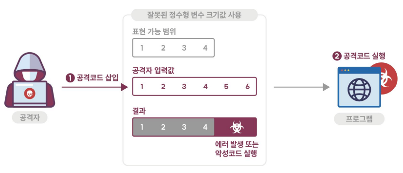 공격 목적 및 발생되는 문제 | 반복문 제어, 메모리 할당, 메모리 복사 등을 위한 조건으로 사용자가 제공하는 입력값을 사용하는 과정에서 정수형 오버플로우가 발생하는 경우 보안상 문제를 유발 |