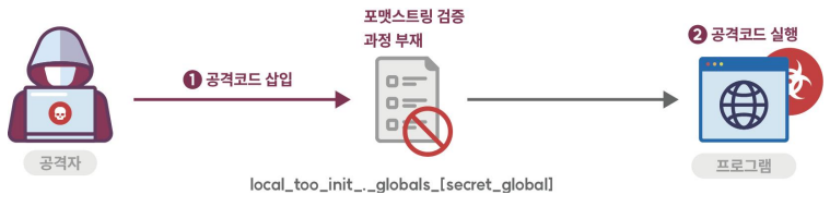 예방법 | • 포맷 문자열을 처리하는 함수 사용 시 사용자 입력값을 직접적으로 포맷 문자열로 사용하거나 포맷 문자열 생성에 포함시키지 않아야 함 • 사용자로부터 입력 받은 데이터를 포맷 문자열로 사용하고자 하는 경우에는 서식 지정자를 포함하지 않거나 파이썬의 내장함수 또는 내장변수 등이 포함되지 않도록 해야 함 |