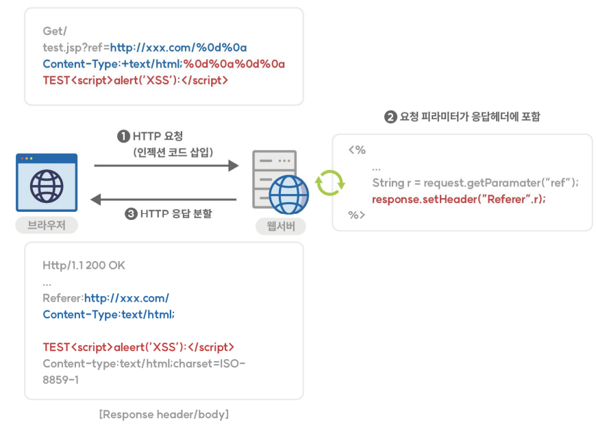 정의 | 분할된 HTTP의 응답에 악의적 코드를 삽입, 실행 할 수 있는 취약점 |