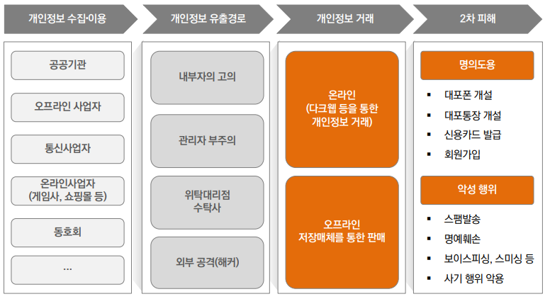< 개인정보 유출 및 침해사고 경로와 2차 피해 >