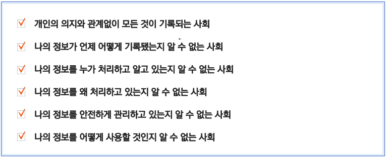 - 정보주체의 의지와 관계없는 지속적인 기록과 관리 -