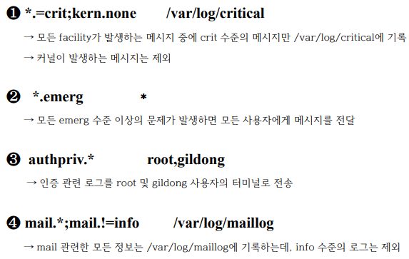 ex) kern.err → err, crit, alert, emerg 항목 로그 생성
