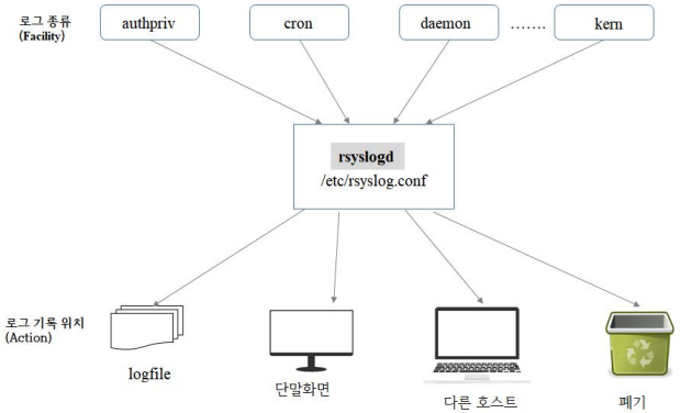 facility: 메시지를 발생시키는 프로그램 유형priority: 위험 정도로 설정한 수준보다 높을 경우 메시지 발생action: 메시지를 보낼 목적지나 행동들로 일반적으로 파일명 기재