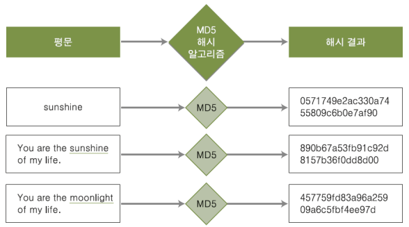 MD2, MD4, MD5가 존재하며MD5는 MD4의 확장판으로 속도가 빠르지는 않지만 데이터 보안성에 더 많은 확신을 제