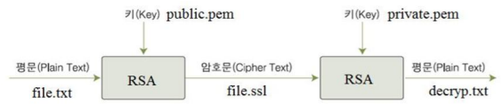 | 공개키로 암호화 | echo 'some text' > file.txt openssl rsautl -encrype -inkey public.pem -pubin -in file.txt -out file.ssl [ file.txt ]의 내용을 RSA 방식으로 암호화한 [ file.ssl ] 생성 |