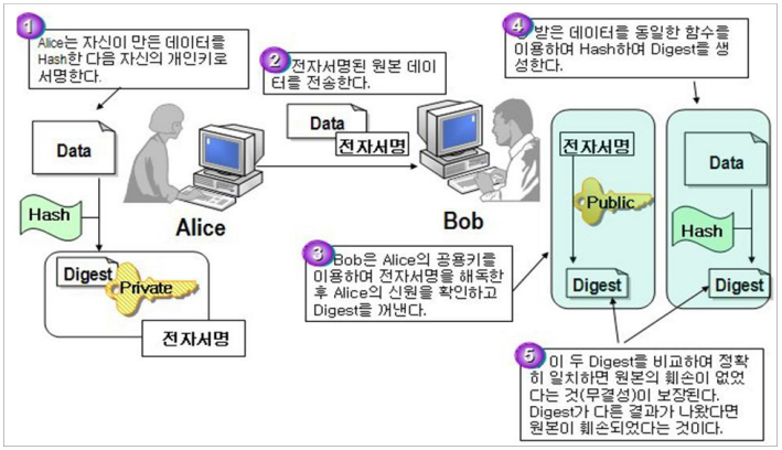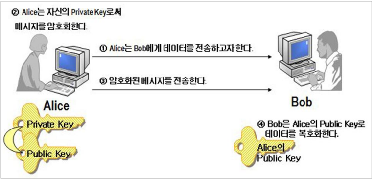 개인키로 데이터를 암호화 하여 Bob에게 전달하여 신뢰성 보장(기밀성은 보장 X)