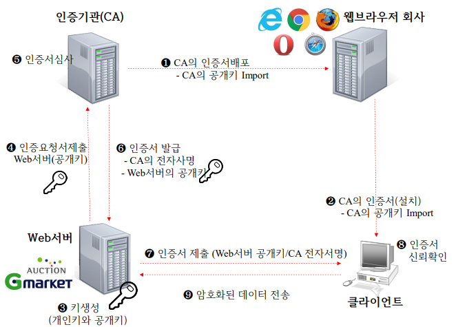 인증서 발급 기관(CA)이 웹브라우저 회사에 인증서(CA 공개키 포함)를 배포