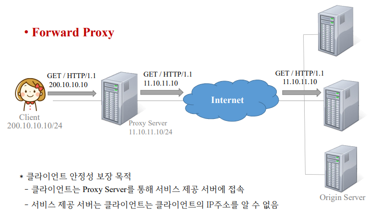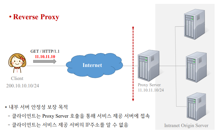 | 보안 | • 실제 서버 또는 클라이언트의 IP를 숨김 • 프록시 서버의 IP만 공개함으로써 해킹 대비 가능 |