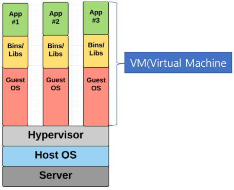 | 특징 | ▪ 가상 머신(VM)은 하이퍼바이저 라고 하는 소프트웨어 리소스가 파티셔닝되어 VM 전용으로 할당될 수 있도록 리소스를 물리 머신에서 분리됨 ▪ 사용자가 물리 환경의 추가 리소스를 요구하는 VM 명령을 발행하면 하이퍼바이저는 이 요청을 물리시스템으로 전달하고 변경사항을 캐싱함 ▪ VM은 물리 서버처럼 보이고 작동하므로 플리케이션 종속성 및 대규모 OS 설치 공간 (단일 애플리케이션이나 마이크로서비스를 실행하는데는 거의 필요하지 않음)의 단점을 증대시킬 수 있음 |