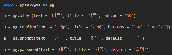 | alert(text, title, button) | 간단한 메세지 박스를 표시할 때 사용 버튼을 누르면 버튼의 value가 리턴 |
